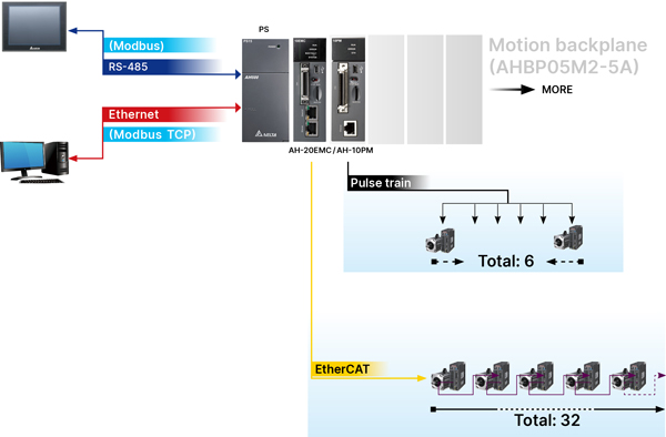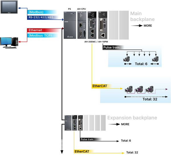 AH Motion is the advanced motion control series with dedicated motion control CPUs and shares the same modules with AH series PLCs. Through the motion control network, such as EtherCAT, AH Motion CPU can perform high-speed, high-precision machine control with the connected servo drives on the motion network.