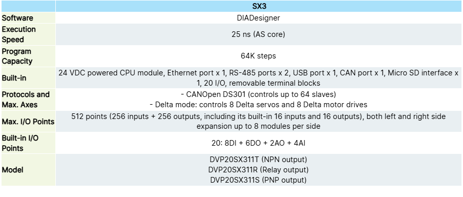 To fulfill the market demands for value-added, compact versatile programmable logic controllers, Delta’s third generation DVP PLCs SX3 series employs the AS series PLC’s 32-bit high-speed processor and provides a user-friendly programming interface, built-in analogues, multiple communication ports, and expanded program capacity. Compared with the second generation, the SX3 series upgrades execution speed, program capacity, information security, and interoperability.